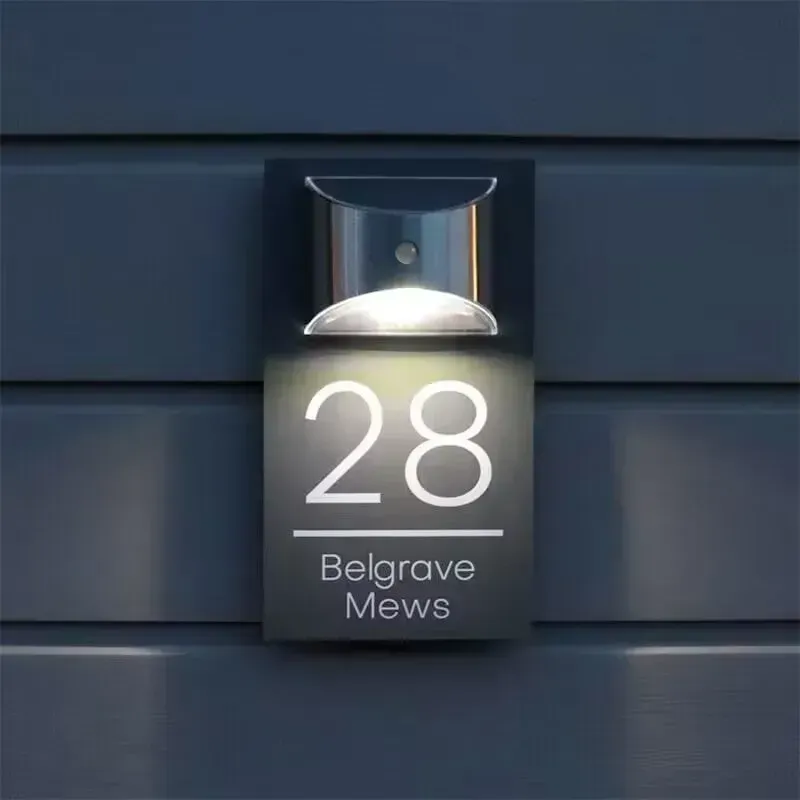 Personalisieren Sie es mit Ihrer Hausnummer und Ihrem Straßennamen für ein persönliches Erlebnis. Solarleuchten aus gebürstetem Aluminium nutzen das Sonnenlicht, um in der Dämmerung eine warme und einladende Atmosphäre zu schaffen.